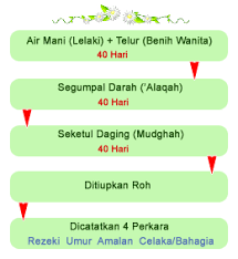 percantuman benih lelaki dan perempuan yang dikenali sebagai NUTFAH. kemudiannya menjadi segumpal darah (ALAQAH) kemudiannya seketul daging (MUDGHAH) kemudian menjadi beberapa tulang (I'ZHAM) kemudian tulang yang dibaluti dengan daging seterusnya lembaga yang ditiupkan roh oleh Allah . Firman Allah berbunyi: